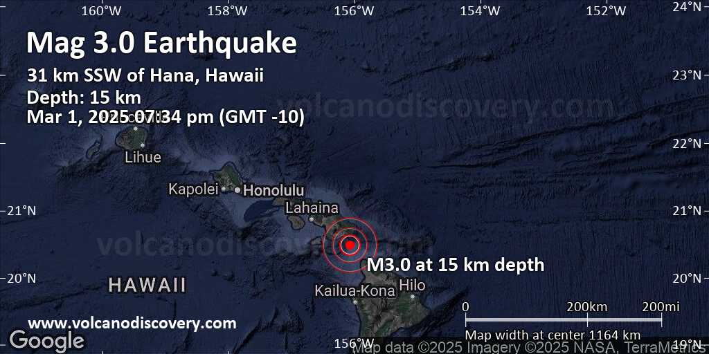 حجم صغير 3.0 زلزال يضرب 31 ميلًا جنوب شرق Kīhei ، هاواي ، الولايات المتحدة في وقت مبكر من المساء